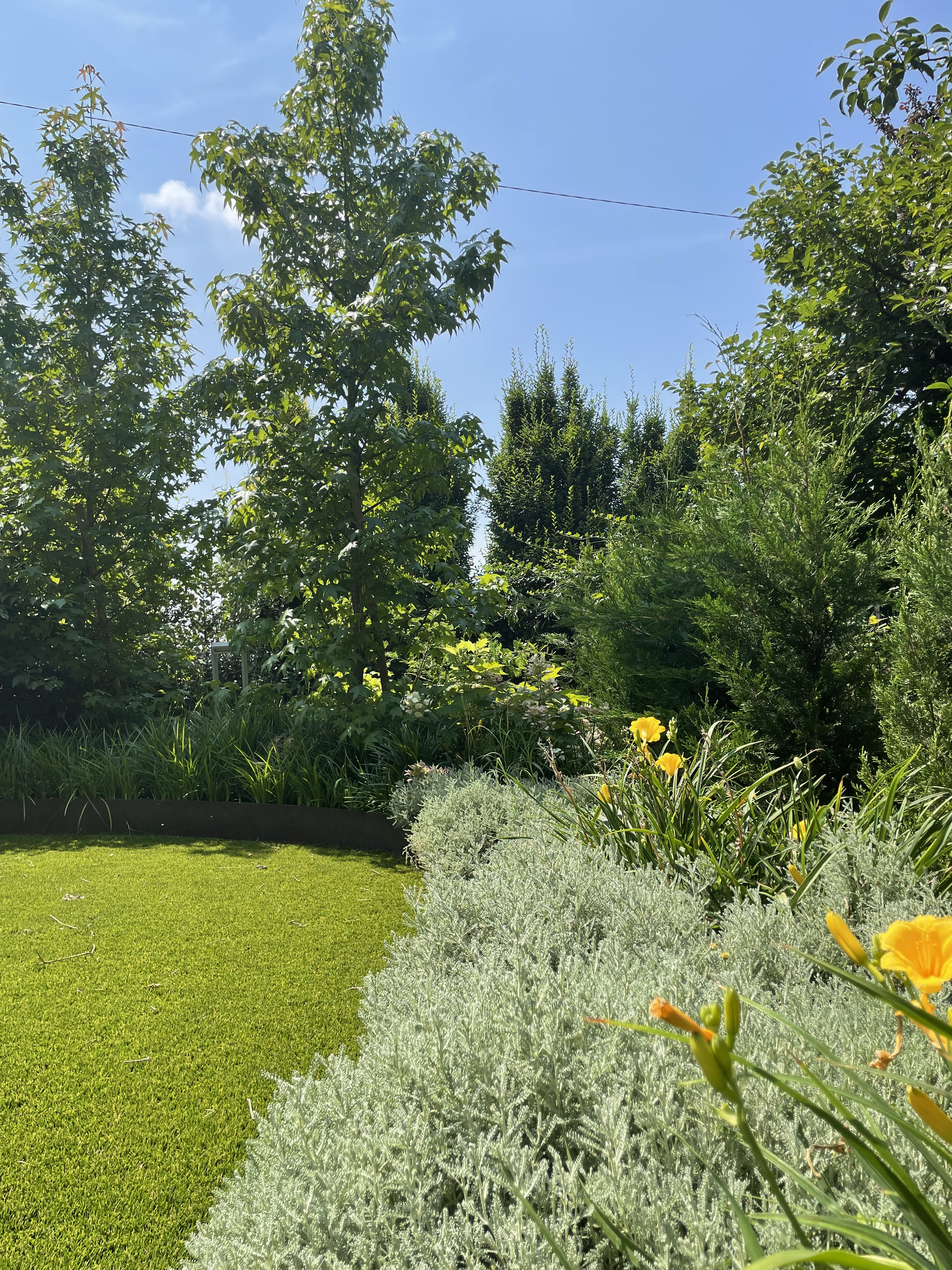 Lungo i lati orientale e occidentale del giardino, la presenza di una siepe di Leylandii, dal carattere architettonico, garantisce riservatezza nei confronti dei confinanti. Inoltre, una cornice in ferro ossidato separa la grande vasca dalle forme organiche dall'area prativa circostante l’abitazione. Tale vasca, arricchita con perenni alternati a sempreverdi, supporta alberi ad alto fusto, che contribuiscono a modulare luce e profonda ombra degli spazi.