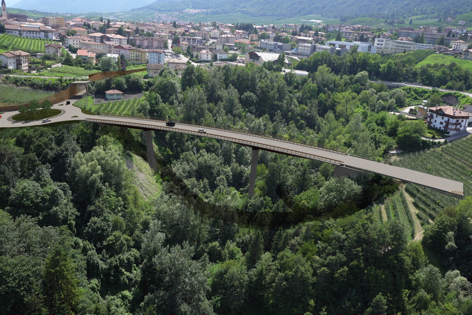 The project is developed in 5 interventions: 3 roundabout, 2 portal for the new gallery at the entrance and the exit of the city of Cles and a bridge.